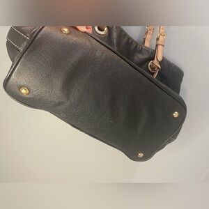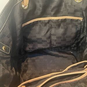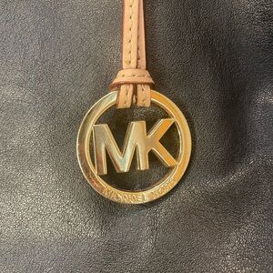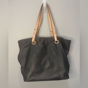 Michael Kors tote, Jet Set bag, MK black leather purse, large shoulder bag, designer handbag, MK charm tote, travel tote, everyday purse, classic tote, luxury handbag, logo interior, Michael Kors Jet Set, black and tan handbag