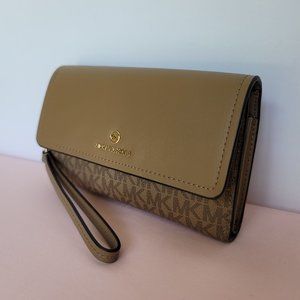 BRAND NEW WITH TAGS. Husk Multi color. A large sized trifold flap-over wristlet/wallet with snap-closure with plenty of pockets to keep your essentials organized is perfect for on-the-go lifestyle. Crafted of colorblocked Signature logo Polyvinyl chloride/ PVC. Features an ID window, a Tech-friendly pocket, a large zip-pocket plus more. It comes with a detachable MK Charm logo strap to carry as a wristlet or inside of a larger bag.