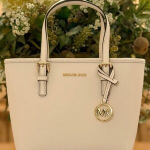 Michael Kors (Jet Set Collection) convertible Medium tote bag in a beautiful crème color w/gold accents ,zippered top,crossbody strap