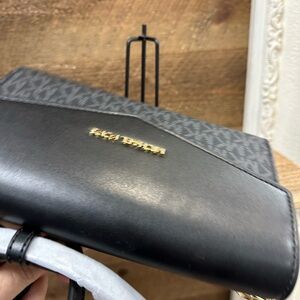 ✨ Classic Michael Kors crossbody with a sleek, modern design. Features the signature MK logo canvas paired with smooth black leather flap and gold-tone hardware.