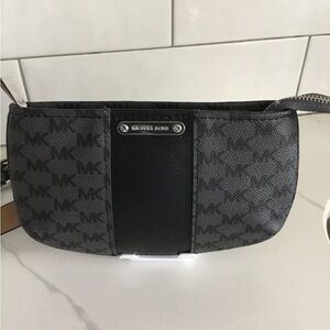 The perfect accessory for any occasion. Size L/XL with a sleek black exterior made of coated leather and a silver MK signature logo, this bag is both stylish and functional. It features an adjustable strap, leaving you comfortably hands free on your everyday outing. Top closure on bag.