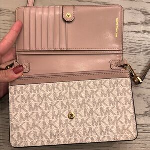 Classic and functional, this Michael Kors Jet Set crossbody features the iconic MK logo print in vanilla with blush pink leather trim and gold-tone hardware. Flap design opens to multiple card slots, zip pocket, and roomy compartments to keep essentials organized. Convenient exterior back pocket fits most cell phones for quick access — one of the most-loved features of this style. Adjustable crossbody strap for hands-free wear. Pre-loved and carried, but still in good condition with light signs of wear on leather and strap.