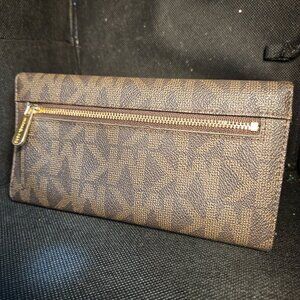 Vintage, Discontinued "Jet Set" (# 32F1GJSE4B) PVC brown continental wallet with flap envelope design / snap closure / gold tone hardware / front rectangular nameplate / signature MK logo emblems / removeable checkbook / exterior zip coin pocket / multiple cards slots / two clear ID windows / pen holder loop / interior satin lining by Michael Kors.