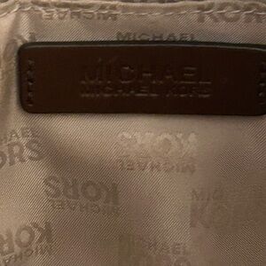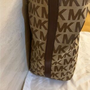 "MK" monogram jacquard pattern in tan and brown with leather straps and gold hardware.