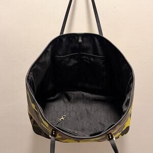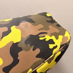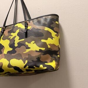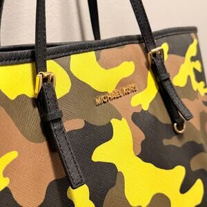 Absolutely beautiful and RARE authentic Michael Kors Jet Set Large Tote in the Acid Lemon Camo colorway. Gold-tone hardware with black leather straps — perfect for everyday, travel, or as a laptop bag. Shows light markings on the front, slight discoloration on the bottom, and the detachable MK charm is missing. Nothing that takes away from the look or condition, especially for such a hard-to-find piece. Good pre-owned condition. No dust bag.