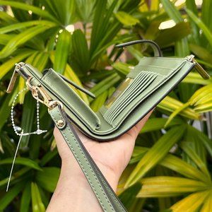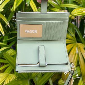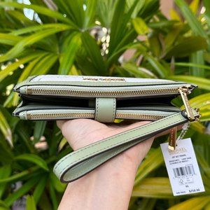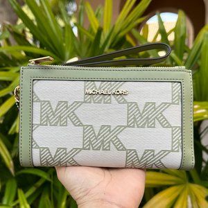 Michael Kors Jet Set Large Double Zip Phone Wallet Graphic Logo MK Light Sage