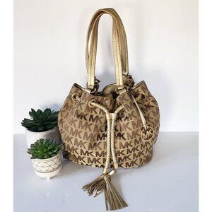 Durable and spacious tote measures approx. 15.5"W x 11"H and additional 10" handle drop. Signature MK brown and cream tonal logo print jacquard with subtle gold thick braided leather drawstring closure and handles. Gold metallic leather trim tassels and gold tone accents and MK logo hangtag. Magnetic closure.