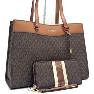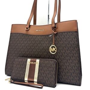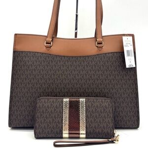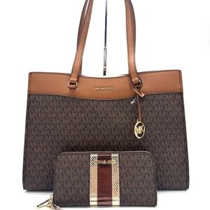 Michael Kors Jet Set Large Signature Logo Tote Bag & Continental Wallet Brown
