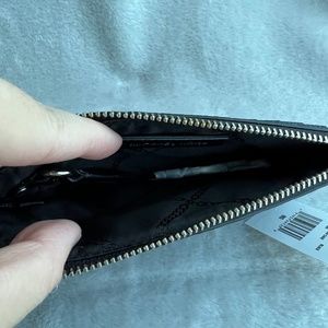 Large pebbled-leather slim card case in black from Michael Kors. Front has a slip pocket. Back has 2 slip pockets and 9 card slots. Zippered pocket has 3 card slots inside and a key ring. Hardware is silver. Case is approximately 7” wide x 3.5” high x 0.5” thick.