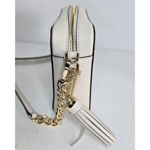* It has a zip closure, adjustable beige leather crossbody strap, and gold hardware.