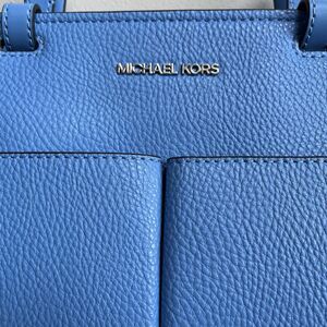 This Michael Kors Jet Set tote bag is a stylish accessory for any occasion. With a pebbled finish and south Pacific exterior color, it is a classic and designer piece that will make a great addition to your collection. The bag has double handles and a zip closure, making it easy to carry around. It has a medium size, measuring 14.5 inches in width, 10.25 inches in height, and 6.75 inches in depth.