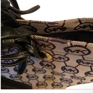 Beige & black Michael Kors monogram print jacquard with black leather trim and golden hardware