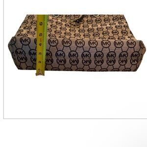 Open top with a center magnetic closure and removable Michael Kors circular logo charm