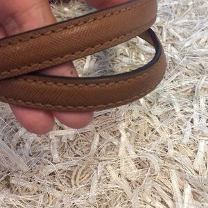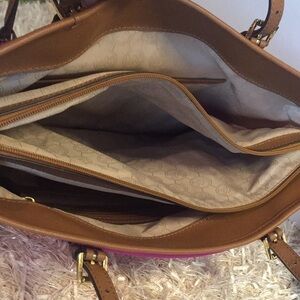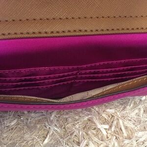 Interior: center zip compartment, 1 zip pocket, 3 open pockets and one cell phone pocket.