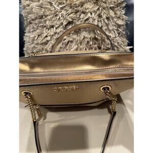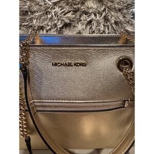 The Michael Kors Jet Set Item Medium Front Pocket Chain Tote Bag Purse in pale gold is a stylish and versatile handbag perfect for various occasions. This rectangular-shaped bag features a zip closure, double handles in pale gold, and gold-toned hardware accents. Made from leather with a satin fabric lining, this medium-sized tote bag is designed for travel, weddings, parties, casual outings, formal events, work, and business meetings. It also includes chain straps, pockets, and a branded card accessory, making it a must-have designer piece for any fashion-forward woman.
