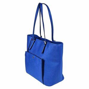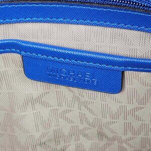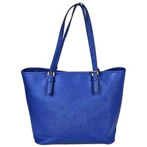 Michael Michael Kors Jet Set Pocket Tote. Saffiano leather (scratch and scuff-resistant) in royal blue. LARGE triple compartments. Double handles with 9" drop. Open top. Center zip compartment, 1 cellphone pocket, 3 slip pockets, and a key fob. Silvertone hardware. This classic bag is a wardrobe staple. Great for office, travel, and everyday use. ALL PHOTOS ARE OURS, AND NO STOCK PHOTOS.