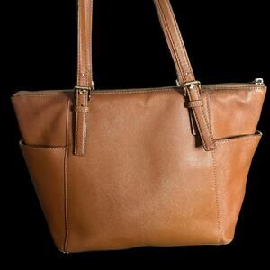 Zip top with a zip compartment, 4 slip pockets, and a hook attachment that you can put your keys, wallet, etc. on