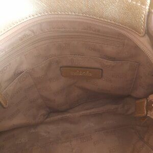 The Michael Kors Jet Set Signature Chain Shoulder Tote is a medium-sized shoulder bag in a solid brown gold color with gold hardware accents. It features double gold handles, a zip closure, and inner pockets for organization. The exterior is crafted from a combination of materials, with a beige lining providing a clean and stylish interior. This tote is part of the Michael Kors Jet Set Travel collection, offering a blend of fashion and functionality for the modern woman on the go.