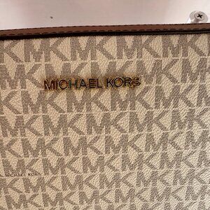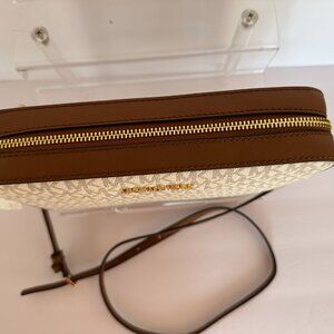 This Michael Kors Jet Set crossbody bag combines timeless style with everyday functionality. Crafted from durable coated canvas in the brand’s iconic vanilla MK monogram print, it features sleek leather trim in acorn brown for a sophisticated contrast. The structured silhouette keeps its shape while the adjustable crossbody strap provides comfortable, hands-free wear. Finished with gold-tone hardware and the signature Michael Kors logo at the top, this bag is perfect for casual outings or dressier occasions.