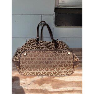 This Michael Kors tote bag combines functionality and style. The durable canvas exterior features the iconic MK logo print in an elegant brown tone. Its spacious interior and leather accents provide practicality and a touch of luxury, suitable for daily use or travel. Gold hardware adds a sophisticated finish.
