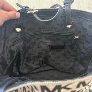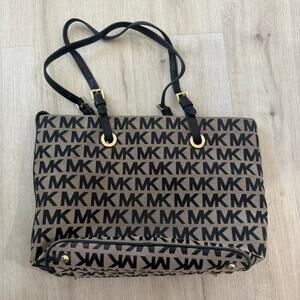 Michael Kors Jet Set Signature Monogram Canvas Tote Bag Purse Black Tan