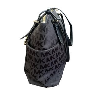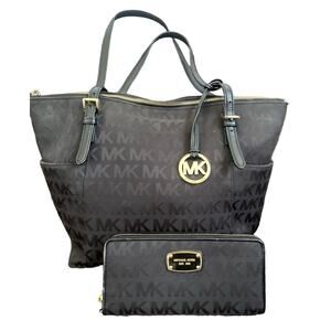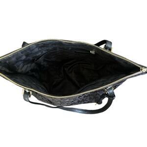 Black Jet Set Signature Canvas Tote. Interior and exterior pockets. Top handles, silver hardware, zipper pocket, zipper closure. Logo lining.