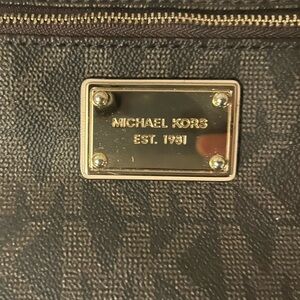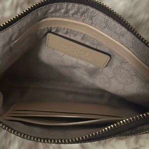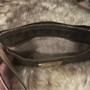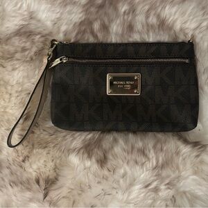 This Michael Kors wristlet purse in brown features a logo pattern with a zip closure. It has a brown leather handle/strap. The interior is lined with brown fabric and has inner pockets. The exterior is made of leather with gold hardware accents, and it belongs to the Michael Kors Jet Set product line, suitable for women who appreciate designer accessories.
