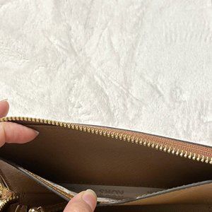 Some tarnishing on the gold hardware as shown in the picture. The wristlet strap does not swivel-it was broken so I superglued it to fix it therefore it is fixed in that one position. The wristlet is able to fit my iPhone 12 pro with a casetify case on.