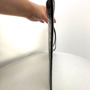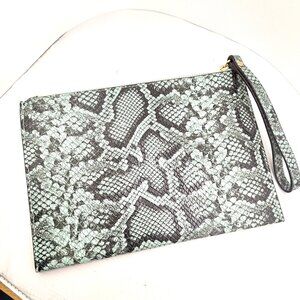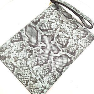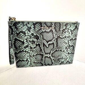 A stunning and chic statement piece from Michael Kors. This large flat wristlet is crafted from genuine python-embossed leather in a beautiful teal, aqua, and black colorway. It features a secure zip-top closure, a convenient wrist strap, and a spacious interior with slip pockets to keep your essentials organized. Perfect for a night out, a special event, or for adding a pop of color to your daily routine inside a larger tote.