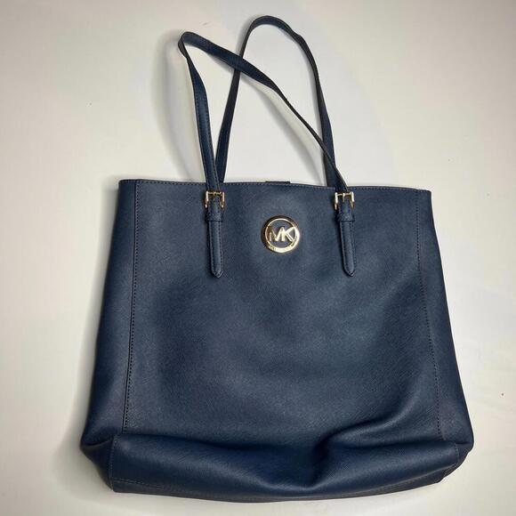 Stylish Michael Kors Jet Set tote bag in durable navy blue saffiano leather. Features gold-tone MK logo medallion, double shoulder straps, and signature Michael Kors printed fabric lining. Spacious interior perfect for daily essentials. Gently used with light wear; overall in very good condition.