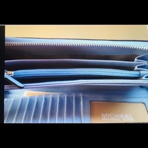 Pebble leather, gold tone hardware. Zip around closure. Detachable wrist strap. Saffiano interior leather, 2 bill compartments, 3slip pockets, zip coin picket , ID window and 16 credit card slots. COLOR: Light Sky