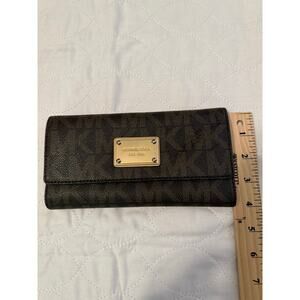 Michael Kors wallet, MK Jet Set Travel, brown logo wallet, continental clutch, PVC leather wallet, designer wallet, MK signature purse accessory, gold plate logo wallet