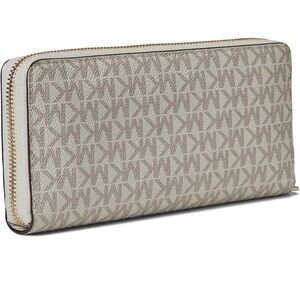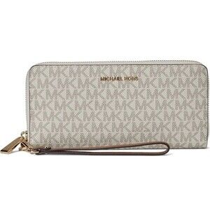 The Michael Kors Jet Set Travel Continental Wallet in Vanilla Logo-Print is a stylish and practical accessory for women. Made from a blend of polyester, polyurethane, canvas, and cotton, this wallet features a luxurious ivory color and a signature logo print. With accents like a zipper and logo detailing, this wallet is not only fashionable but also functional, with features like credit card slots and a phone pocket. The wristlet style makes it convenient for on-the-go use, adding a touch of modern elegance to any outfit.