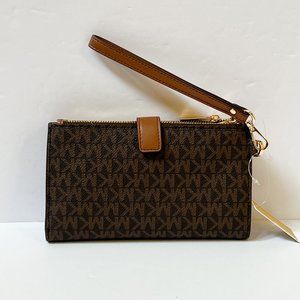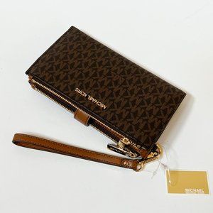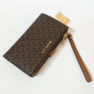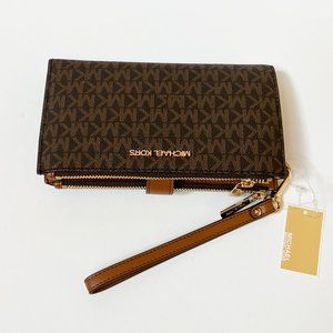 Michael Kors Jet Set Travel Double Zip Large Phone Wallet Wristlet MK Brown
