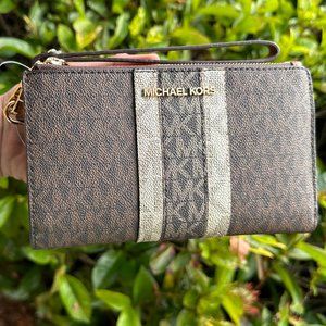 Michael Kors Jet Set Travel Double Zip Wallet Center Stripe MK Gold Brown Multi