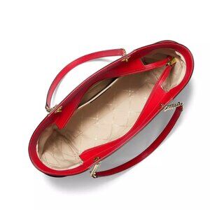 Crafted for the modern woman, the Michael Kors Jet Set Travel Large Chain Leather Shoulder Bag in vibrant red is a testament to sophisticated style and functionality. The bag boasts a sleek, rectangular silhouette with a coated canvas and leather exterior, complemented by a durable stainless steel and leather strap. The spacious interior is lined with polyester and includes both inner and outer pockets, perfect for keeping essentials organized and within reach. From the boardroom to the airport, this shoulder bag is versatile for any occasion, seamlessly transitioning from business to casual and even to formal events. It features a zip closure, gold hardware accents, and a 10" handle drop for comfortable carrying. The bag also comes with a brand card and bag charm for added authenticity and flair. This piece is a shining example of the fusion of durability, elegance, and practicality that the Michael Kors brand is known for.