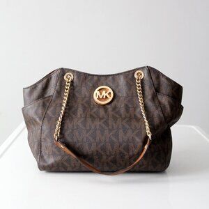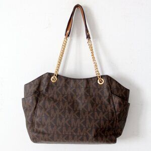 Classic and sophisticated, this Michael Kors Jet Set Travel Large Chain Shoulder Tote features the brand’s signature brown PVC monogram accented with gold-tone hardware. The bag has chain-linked leather shoulder straps, an open top with a center zip compartment, and spacious side pockets. The interior is lined with the MK logo fabric and includes a zip pocket and slip pockets for easy organization. A gold MK medallion logo adorns the front for a timeless finish.