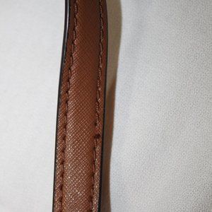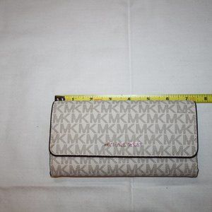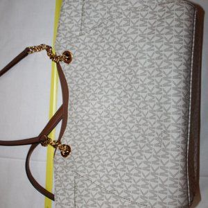 Lovingly cared for, Pre Owned Michael Kors Tote and Wallet. Bag and wallet are white and camel colored with MK logo. Sold as a set.