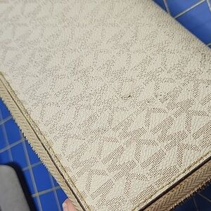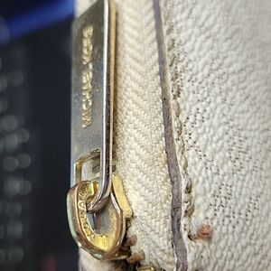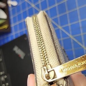MK4 wallet with signature MK pattern. Gold-tone zipper and logo detail.