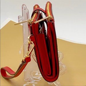 Gold hardware Interior features 1 ID window pocket, 6 credit card slots, 2 slip pockets, 1 phone pocket, bill compartment and 2 zipper compartments