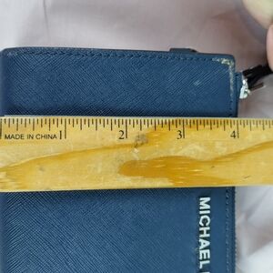 The Michael Kors Jet Set Travel Large Double Zip Wristlet Wallet in Navy is a stylish and functional accessory for women. Made of saffiano leather with a canvas fabric type, this wallet features a solid navy blue color with signature logo accents. It boasts a large size with a 7-inch length and multiple compartments for credit cards and a phone. The wallet is designed with a wristlet style for easy carrying, making it a practical choice for on-the-go use.