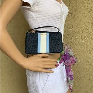 NWT authentic women’s Michael Kors Jet Set Travel Large Top Zip Wristlet is crafted in monogram printed PVC and finished with polished hardware. This top zip style wristlet is lined in custom logo printed fabric and features 3 inner card slips. It has a fully zippered top closure and the front is accented with Michael Kors logo. It has a leather wristlet strap with a drop of about 5.5 inches, and measures approximately 7.5 inches (L) x 4.25 inches (H) x 1 inches (W). It has an MSRP of $148.00.