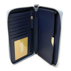 Michael Kors Jet Set Travel Large Flat Zip MF Phone Case Wristlet Wallet Pale Blue/Navy Signature