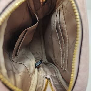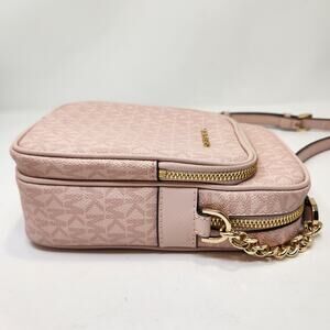 Michael Kors Jet Set Travel North South Chain Crossbody bag, Dark Powder Blush Pink Logo signature pebbled canvas, gold tone hardware, two zipper compartments, outer slip pocket, inner card slots and slip pockets, logo beige lining, adjustable buckle crossbody strap
