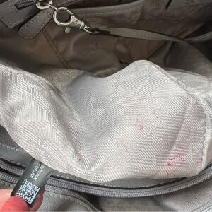 Overall very good condition- a few flaws/stains on interior lining. Handle had peeling trim that has been glued. See photos.