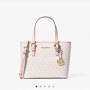 NWT Stylish Michael Kors tote bag in white with pink accents. Features signature MK logo pattern and gold. hardware. BRAND NEW!!!