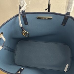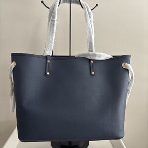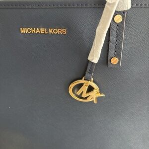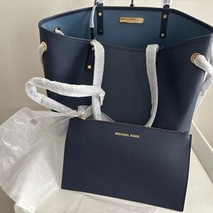 Michael Kors Jet Set Travel Navy Large Drawstring Leather Tote. Blue color interior. Gold hardware. Brand New never used with original wrappings and price tag. Includes large wristlet clutch. Shoulder bag.
