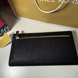 This sophisticated Michael Kors wallet, crafted from textured saffiano leather, features a sleek rectangular design in classic black. The gold-tone hardware and branding add a touch of elegance, making it a timeless accessory for any occasion.