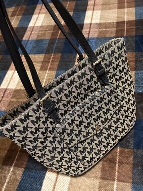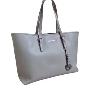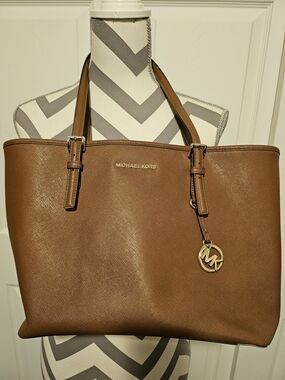 Jet Set Travel XS Carryall Convertible Top Zip Tote in DK Sangria Saffiano leather. This sophisticated handbag features a structured silhouette with gold-tone hardware, including the signature MK logo charm and front lettering. The interior is lined with custom logo fabric and includes a zippered pocket for organization. Designed with dual top handles and an adjustable, removable crossbody strap (still in original packaging), it offers versatile carrying options. A rear exterior slip pocket provides quick access to essentials.
