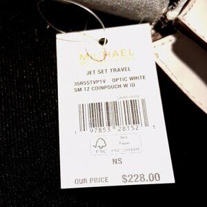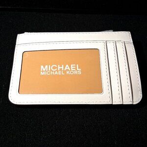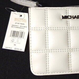 This is a New With Tags Michael Kors Jet Set Travel Small Top Zip Coin Pouch with ID Key Holder in Quilted Soft Leather in Optic White. The tag indicates the pouch retails for $228.00, plus tax. She comes with a silver toned metallic Michael Kors name logo on the quilted side. She has 2 card slots and an ID window on the back along with a receipt pouch. There is a zip top closure and the interior has a custom MK fabric lining. She also has a key holder on a short chain and a slot that holds the care instructions which are included. She measures 5.25"L x 3.5"H x 0.25"D. All packaging materials are still in place. No call outs.